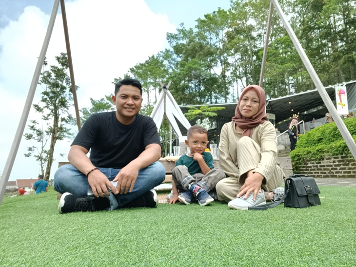 Karena kami minta foto keluarganya maka mas teguh mengambil foto itu. Kelihatan di tempat umum isterinya mau digandeng malu-malu sedang anaknya dengan bebas mengambil posisi yang menarik karena sudah pernah di foto.