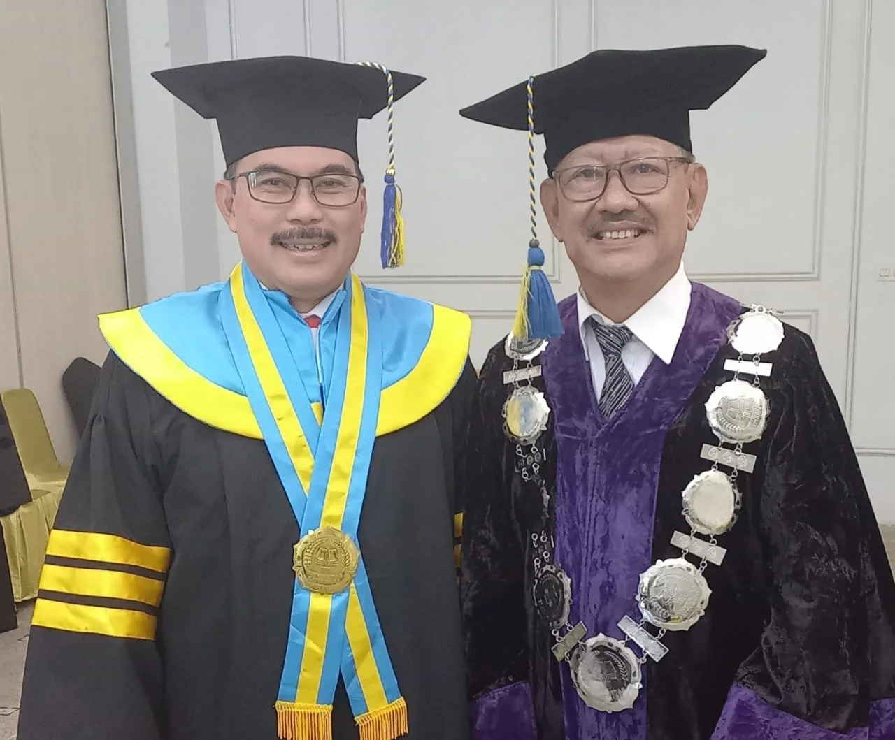 Doktor baru Universitas Satyagama, Marsda TNI Dr Jemi Trisonjaya berfoto bersama salah satu anggota senat, Dr Mulyono D Prawiro