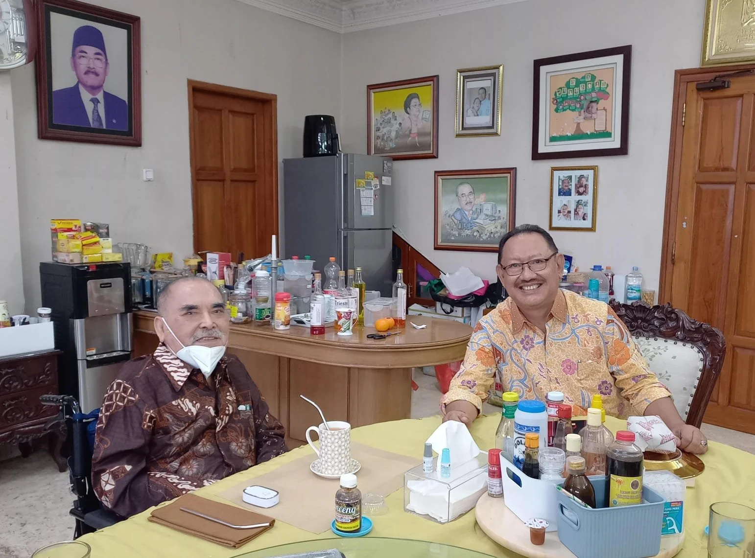 Prof Dr Haryono Suyono terlihat sedang menikmati secangkir kopi hangat di rumahnya, ditemani Dr Mulyono D Prawiro
