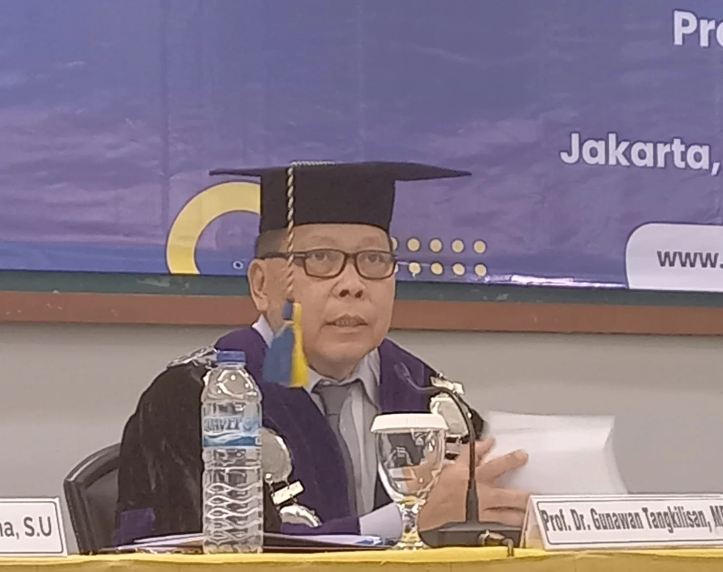 Prof Guntang terlihat sedang mengajukan pertanyaan kepada promovendus Irjen Pol Hermanta pada Sidang Terbuka Promosi Doktor Universitas Satyagama